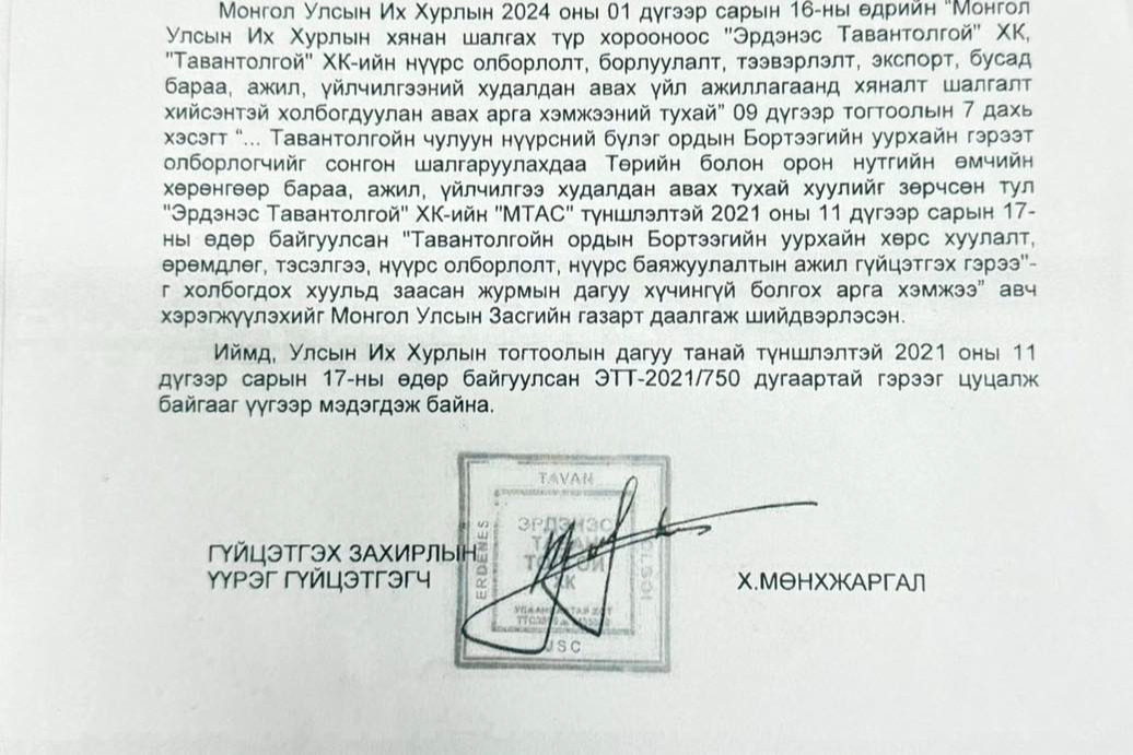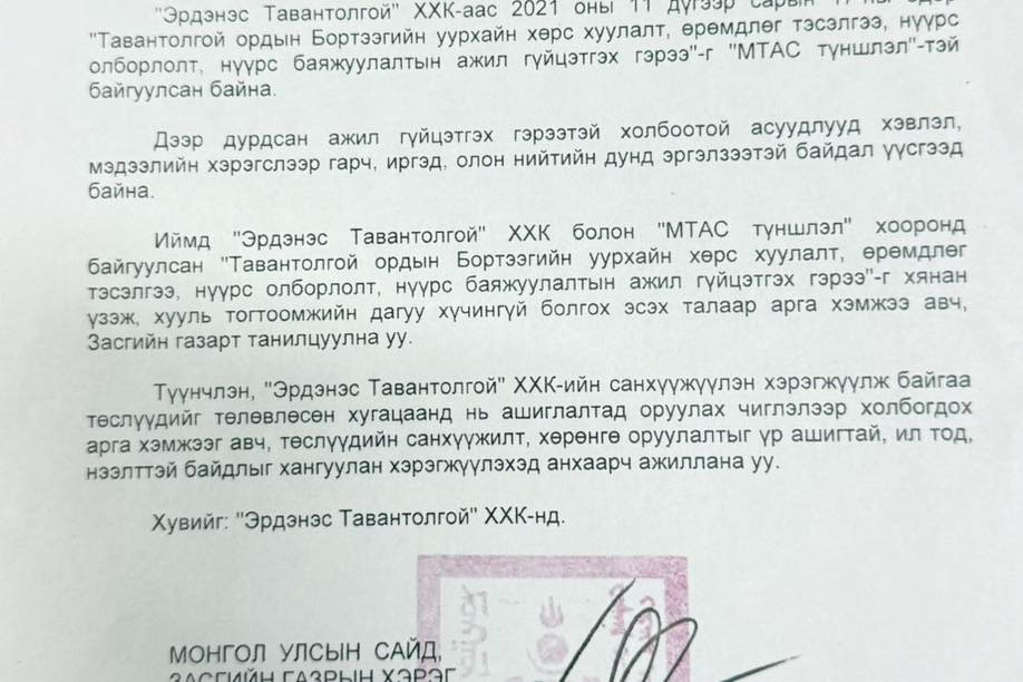 Эрдэнэс Тавантолгой ХХК-аас 2021 онд нээлттэй тендер зарлаж 2021 оны 11-р сарын 17-нд МТАС түншлэл гэдэг компанитай 36 сарын гэрээ байгуулсан ч улстөржилтөөс шалтгаалж 2024 оны 1-р сарын 16-нд уг гэрээг цуцлах УИХ-ын тогтоол гарсан. Тус түншлэлийн Админерал компанид зөвхөн нүүрс угаах үйлдвэр барих 35 га газрыг 5 жилийн хугацаатай ашиглах зөвшөөрөл олгосон ч мөн л цуцлагдсаныг баримтаас харж болно. Энэхүү гэрээний хугацаанд МТАС түншлэл нь нэг ч тонн нүүрс олборлох ажил хийгээгүй байгаа бөгөөд 2025 оны 1-р сард МТАС түншлэлд гэрээ цуцлах мэдэгдлийг Эрдэнэс Тавантолгой ХХК-д хүргүүлж, гэрээний харилцаа бүрэн дуусчээ.