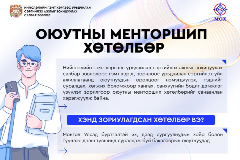 Та бүхнийг Нийслэлийн гэмт хэргээс урьдчилан сэргийлэх ажлыг зохицуулах салбар зөвлөл, Монголын оюутны холбоо хамтран зохион байгуулж буй "ОЮУТНЫ МЕНТОРШИП" хөтөлбөрт урьж байна.