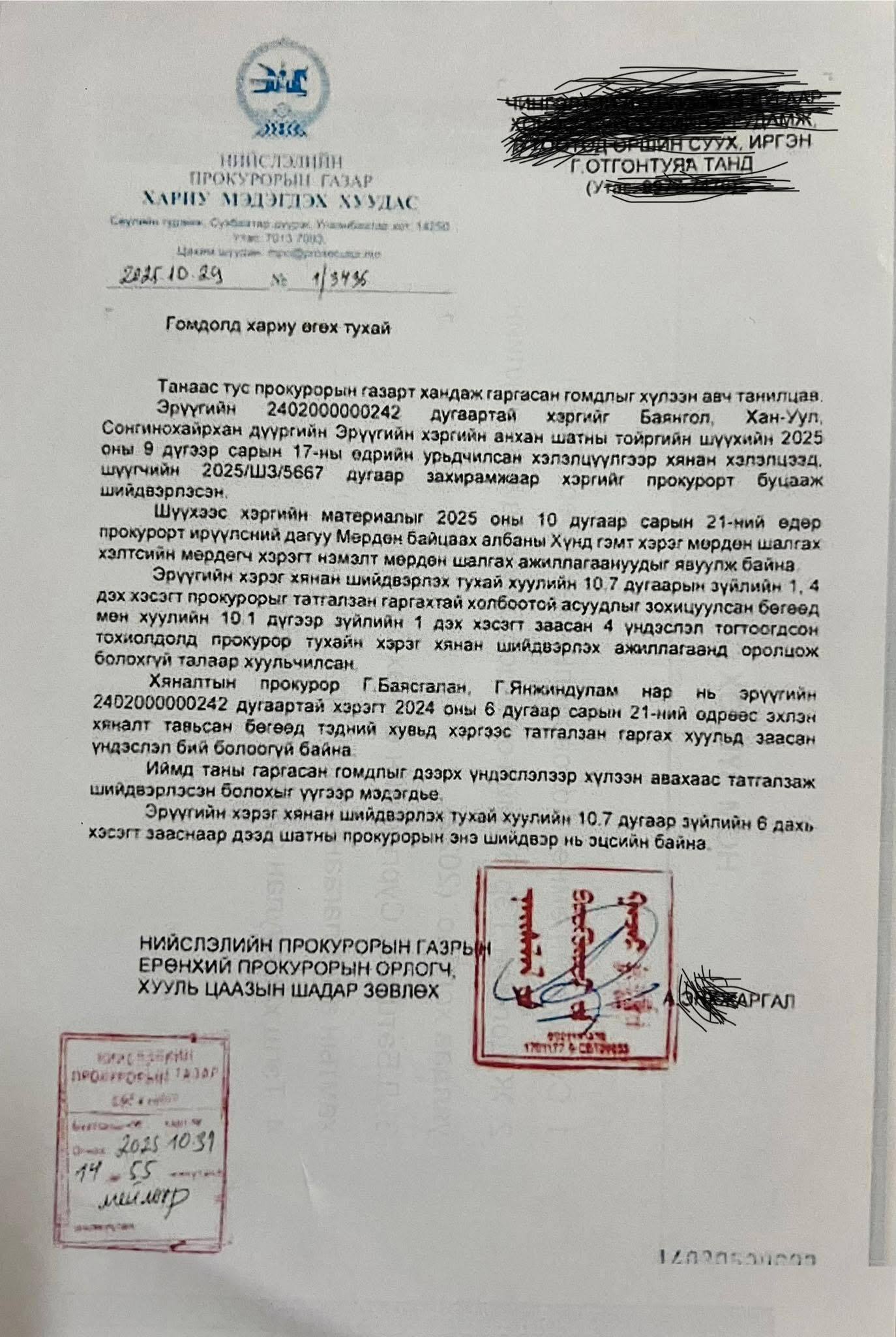 Энэ тухай талийгаач охины ээж н.Отгонтуяа цахим хуудастаа “2025 оны 09 дүгээр сарын 17-ны өдрийн Шүүхийн хэлэлцүүлэг дээр хяналтын прокурор Г.Янжиндулам, Г.Баясгалан нар хэлэхдээ "Энэ хэрэг буцсан ч Э.Ган-Эрдэнэ, Э.Номин-Эрдэнэ нарыг яллагдагчаар татахгүй" гэж бардам хэлж байсан. Эдгээр прокуроруудаас татгалзах миний хүсэлтийг Нийслэлийн прокурор дахин хүлээн авсангүй. Одоо цаашид охины минь хэрэг үнэн зөв шийдэгдэнэ гэдэгт миний бие итгэл алдарч байна.