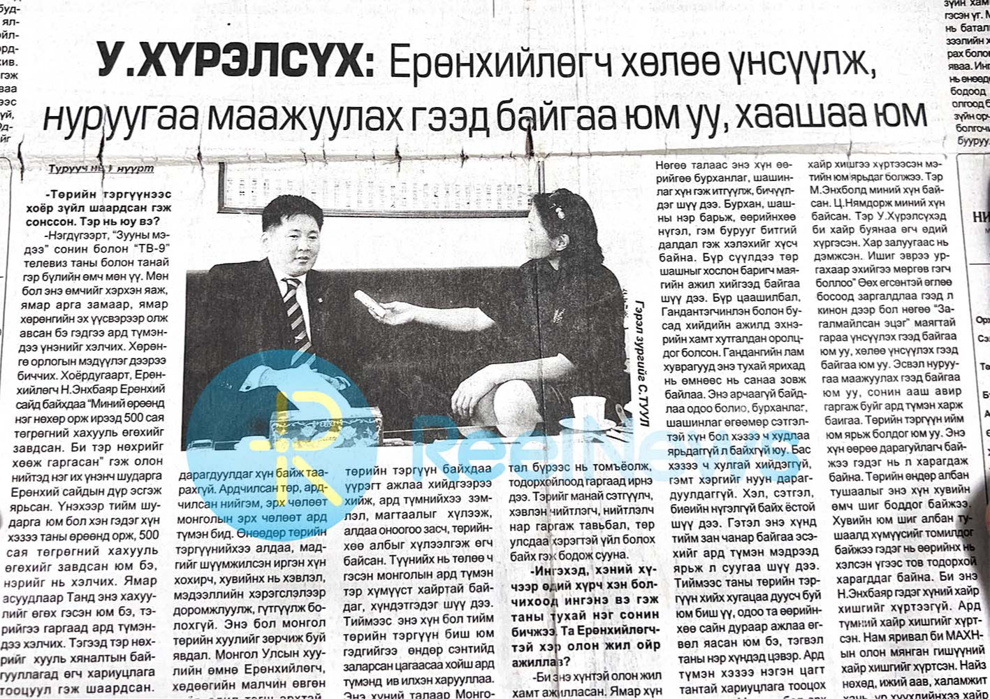 Хоёрдугаарт, Ерөнхийлөгч Н.Энхбаяр Ерөнхий сайд байхдаа “Миний өрөөнд нэг нөхөр орж ирээд 500 сая төгрөгний хахууль өгөхийг завдсан. Би тэр нөхрийг хөөж гаргасан" гэж олон нийтэд нэг их үнэнч шударга Ерөнхий сайдын дүр эсгэж ярьсан. Үнэхээр тийм шударга юм бол хэн гэдэг хүн хэзээ таны өрөөнд орж, 500 сая төгрөгний хахууль өгөхийг завдсан юм бэ, нэрийг нь хэлчих. Ямар асуудлаар Танд энэ хахуулийг өгөх гэсэн юм бэ, тэрийгээ гаргаад ард түмэндээ хэлчих. Тэгээд тэр нөхрийг хууль хяналтын байгууллагад өгч хариуцлага тооцуул гэж шаардсан.