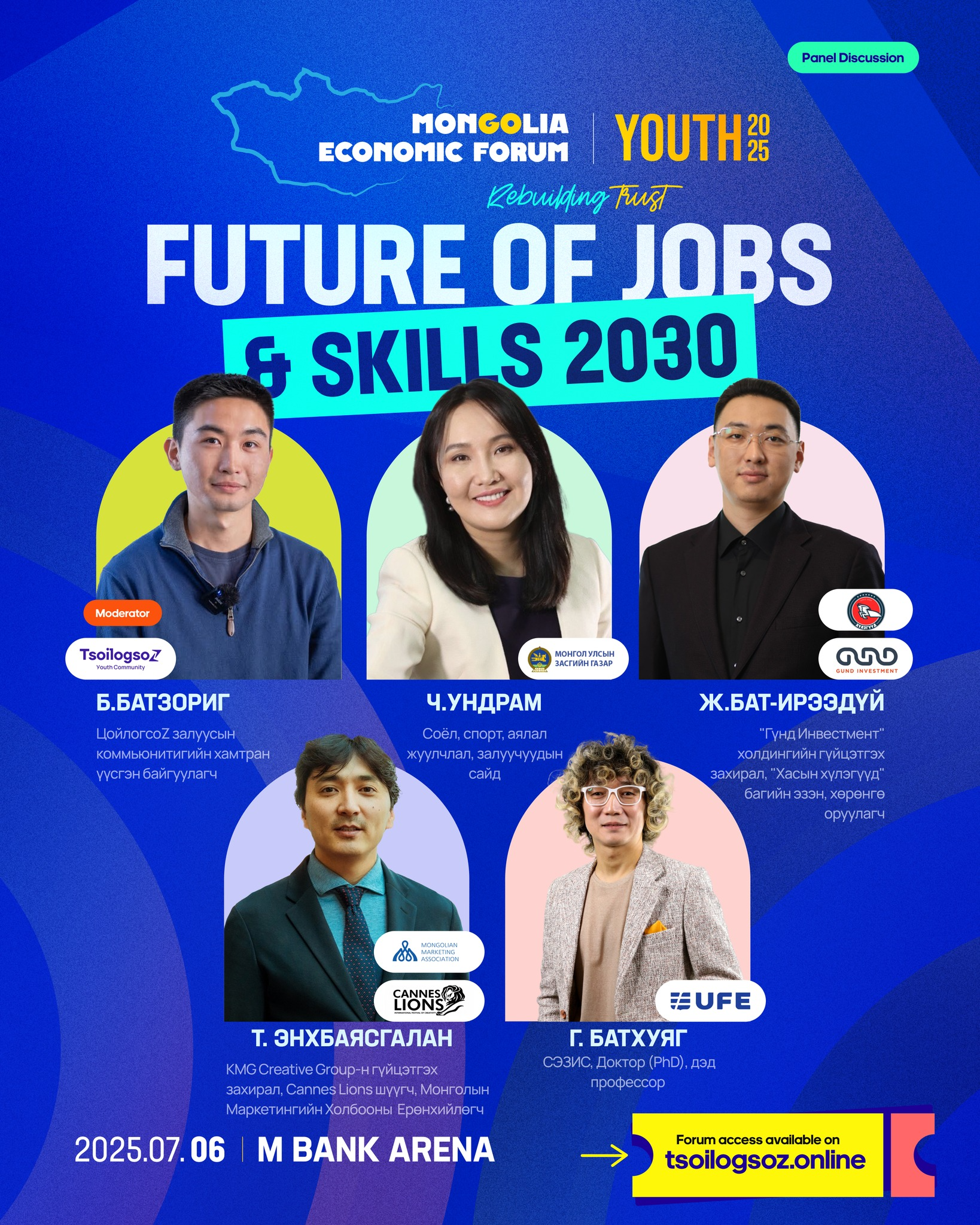 2025 оны 7 дугаар сарын 06-ны өдөр “M Bank Arena”-д зохион байгуулагдсан “Mongolian Economic Forum–Youth 2025: Ирээдүйн хөдөлмөр” арга хэмжээ “Rebuilding Trust: Co-Creating Mongolia’s Future” уриан дор болж, залуусын ирээдүйд зайлшгүй шаардлагатай ур чадвар, ажлын байрны чиг хандлага, нийгэм-эдийн засгийн шинэ боломжуудын талаар өргөн хүрээний хэлэлцүүлэг өрнүүллээ.