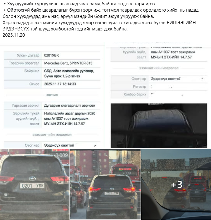 Гэвч хугацаанаасаа өмнө, 10-р сарын 30-нд “Надтай болон хүүхдүүдэд ойртохгүй, уулзахгүй байх” сануулгатайгаар суллагдсан. Тэрэлжийн гүүрэн дээрээс баригдах үедээ Гаальтай Highlander маркийн автомашин дээр 0201УБК хуурамч дугаар зүүж яваад цагдаагийн байгууллагынханд баригдаж хоригдсон байдаг. Одоо ч энэ машинаа энэ дугаартай нь унаж замын хөдөлгөөнд оролцож байгаа нь хууль хүчний байгууллагын шийдвэрийг уландаа гишгэж байгааг харуулж байна. Хуулийн байгууллагад удаа дараа мэдэгдсэн ч өнөөг хүртэл ямар ч арга хэмжээ авч, шалгаж тогтоохгүй байна. Тэр машинтайгаа хэвийн зорчиж, бидэнтэй зам дээр санаатайгаар таарч шахах, мөргөх гэж оролдох, Хүүхдүүдийг сургуулиас нь аваад явах замд байнга өөдөөс гарч ирэх, Ойртохгүй байх шаардлагыг бүрэн зөрчиж, тогтмол тааралдах оролдлого хийх нь надад болон хүүхдүүдэд амь нас, эрүүл мэндийн бодит аюул учруулж байна.