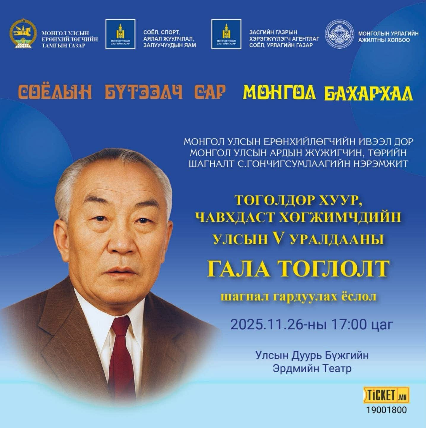 Монгол Улсын Ерөнхийлөгчийн ивээл дор Монгол Улсын Ардын жүжигчин, Төрийн шагналт С.Гончигсумлаагийн нэрэмжит “Төгөлдөр хуур, чавхдаст хөгжмийн улсын V уралдаан”-ы гала тоглолт болон шагнал гардуулах ёслол 2025 оны 11 дүгээр сарын 26-ны өдөр Улсын Дуурь Бүжгийн Эрдмийн Театрт болно.