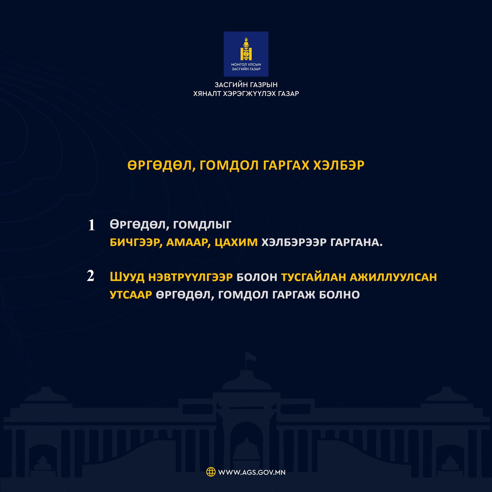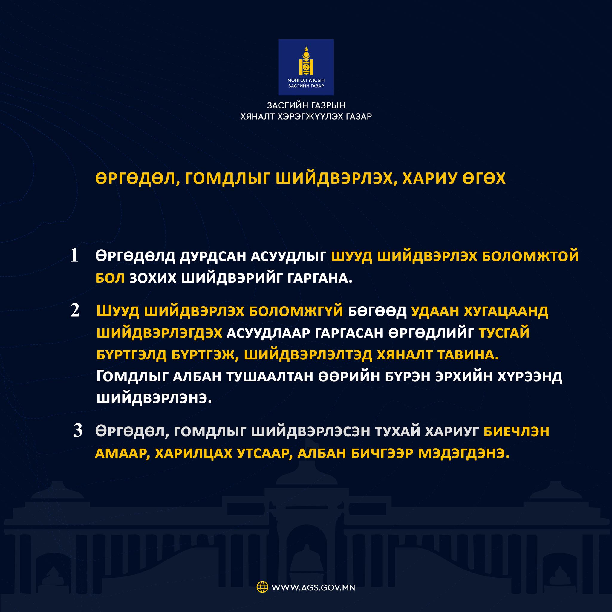 ► Өргөдөл, гомдлыг бичгээр, амаар, цахимаар гаргах боломжтой. Мөн шууд нэвтрүүлэг, тусгай утсаар ч хандаж болно.