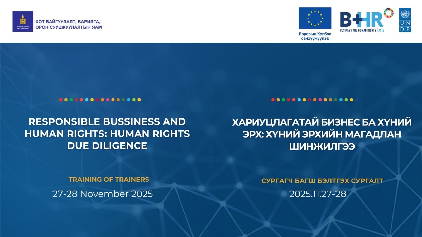 Европын Холбооны санхүүжилттэй "Өөрчлөлтийн элч төлөөлөгчид: Хариуцлагатай бизнесийн төлөөх залуус ба хэвлэл мэдээлэл" төслөөс Хот байгуулалт, барилга, орон сууцжуулалтын яамтай хамтран 2025 оны 11 дүгээр сарын 27-28-ны өдрүүдэд “Хариуцлагатай бизнес ба хүний эрх: Хүний эрхийн магадлан шинжилгээ” сэдвээр барилгын салбарын төрийн бус байгууллага, холбоодын 21 төлөөлөлд зориулсан сургагч багшийн сургалтыг зохион байгууллаа. Энэхүү сургалт нь барилгын салбарт тусгайлан зориулж сургалтын хөтөлбөр, кейсүүдийг салбарын онцлогт нийцүүлэн боловсруулсан анхны сургалт болсноороо онцлогтой.