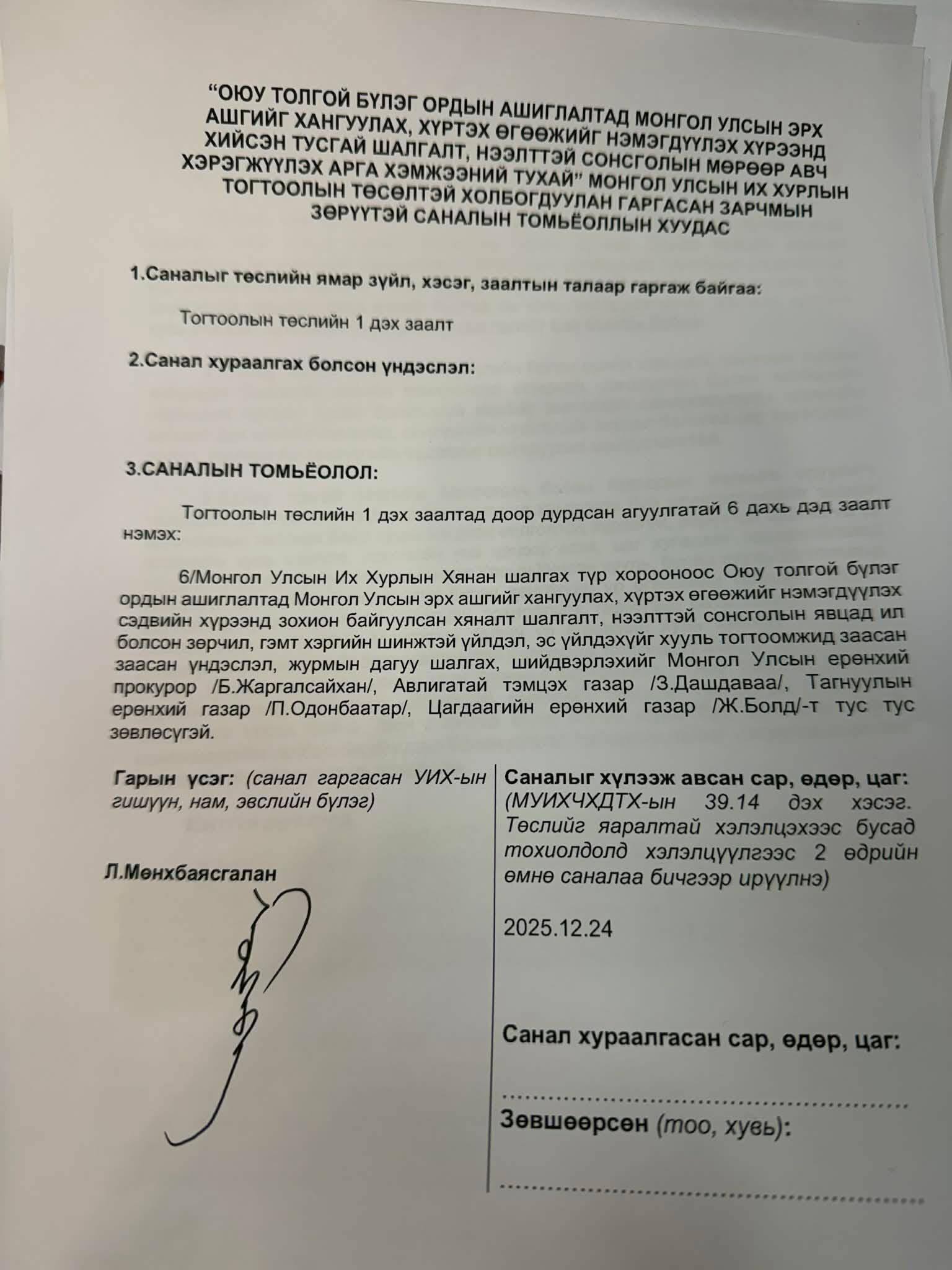 Миний гаргасан зарчмын зөрүүтэй саналд “Монгол Улсын Их Хурлын Хянан шалгах түр хорооноос Оюутолгой бүлэг ордын ашиглалтад Монгол Улсын эрх ашгийг хангуулах ,хүртэх өгөөжийг нэмэгдүүлэх сэдвийн хүрээнд байгуулсан хяналт шалгалт , нээлттэй сонсголын явцад ил болсон зөрчил , гэмт хэргийн шинжтэй үйлдэл, эс үйлдэхүйг хууль тогтоомжид заасан үндэслэл, журмын дагуу шалгах, шийдвэрлэхийг Монгол Улсын ерөнхий проокурор /Б.Жаргалсайхан/ , Авилгатай тэмцэх газрын дарга /З.Дашдаваа/, Тагнуулын ерөнхий газрын дарга /П.Одонбаатар /, Цагдаагийн Ерөнхий газрын дарга /Ж.Болд / нарт тус тус зөвлөсүгэй.