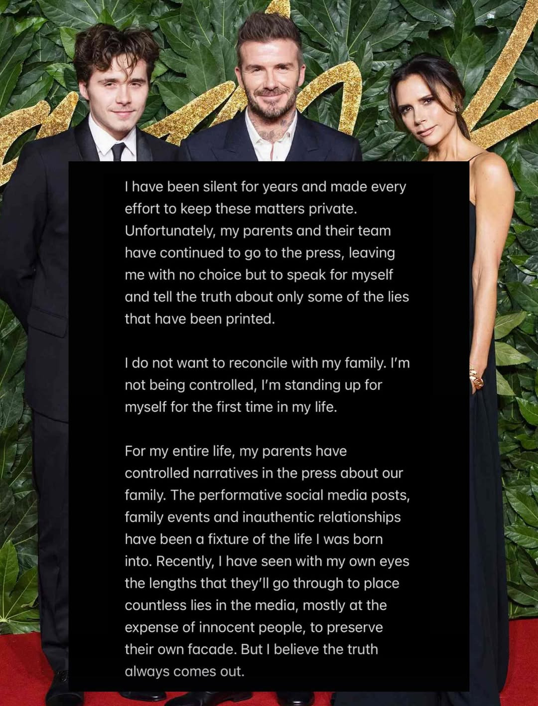 Бруклин Бекхэм төрснөөсөө хойш олны анхаарлын төвд өссөн нэгэн. Харин түүний саяхан Instagram-д нийтэлсэн пост энэ анхаарлыг урьд хожид байгаагүйгээр улам тодрууллаа. Олон нийт Бруклины уран бүтээлийн амжилтыг алдартай эцэг эхтэй нь холбон тайлбарлаж, “nepo-baby” хэмээн нэрлэж буй. Бруклин Бекхэм өөрийн алдартай эцэг эх болох хөлбөмбөгийн домог Дэвид Бекхэм, “Spice Girls” хамтлагийн гишүүн асан өдгөө загвар зохион бүтээгч болсон Виктория Бекхэм нартайгаа харилцаагаа тасалснаа инстаграм сторигоор баталснаар хэвлэл мэдээллийн гол сэдэв болоод байгаа юм. Тэдний хоорондын зөрчлийн тухай цуурхал Бруклин Никола Пелтзтэй 2022 оны дөрөвдүгээр сард хуримаа хийснээс хойш эрчимжиж эхэлжээ.