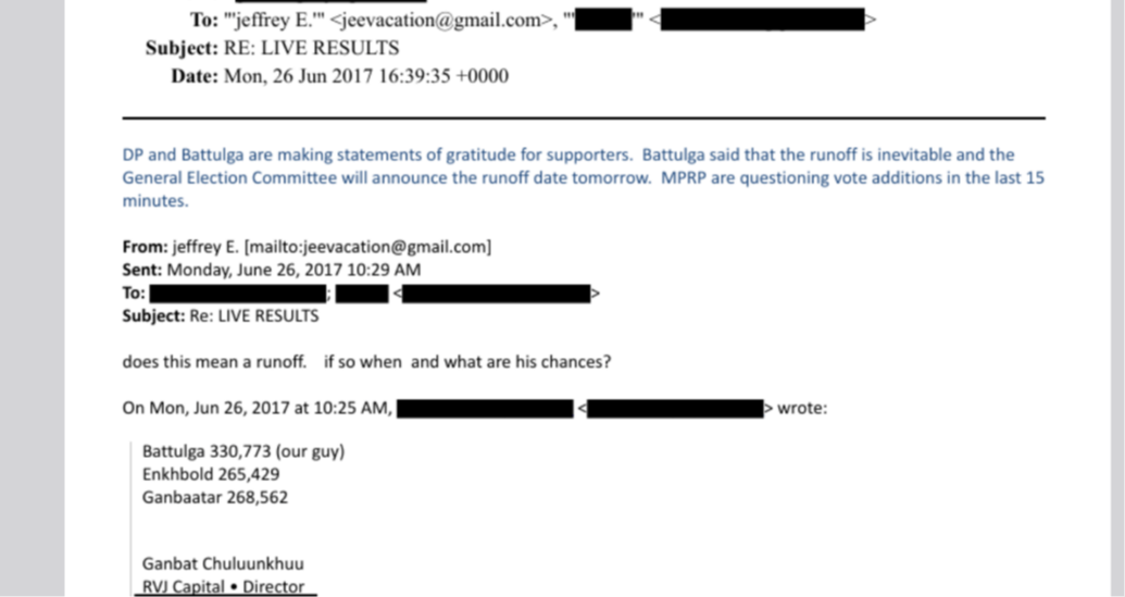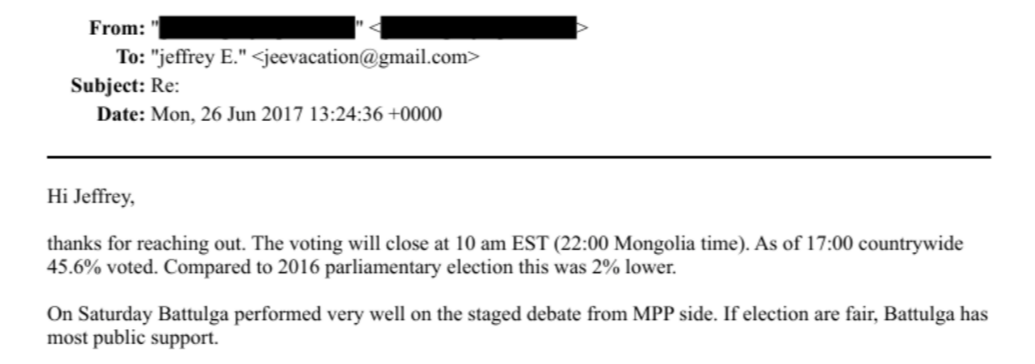Дээрх мэйлийг (2017 оны 6 сарын 26-ны өдрийн 13 цагийн орчимд) Чулуунхүүгийн Ганбат гэх мэйлээс илгээсэн бөгөөд агуулга нь "Санал хураалт Монголын цагаар 22 цагт дуусна. 17 цагийн байдлаар 45,6% нь санал хураалтад оролцсон байна. Өмнөх сонгуулийн ирцтэй харьцуулахад 2% доогуур үзүүлэлт юм. Бямба гарагт Баттулга МАН-ын өрсөлдөгчтэй мэтгэлцээнд маш сайн оролцсон. Хэрэв сонгууль шударга болвол Баттулга олон нийтийн дэмжлэгийг хамгийн их авах хүн" гэжээ.