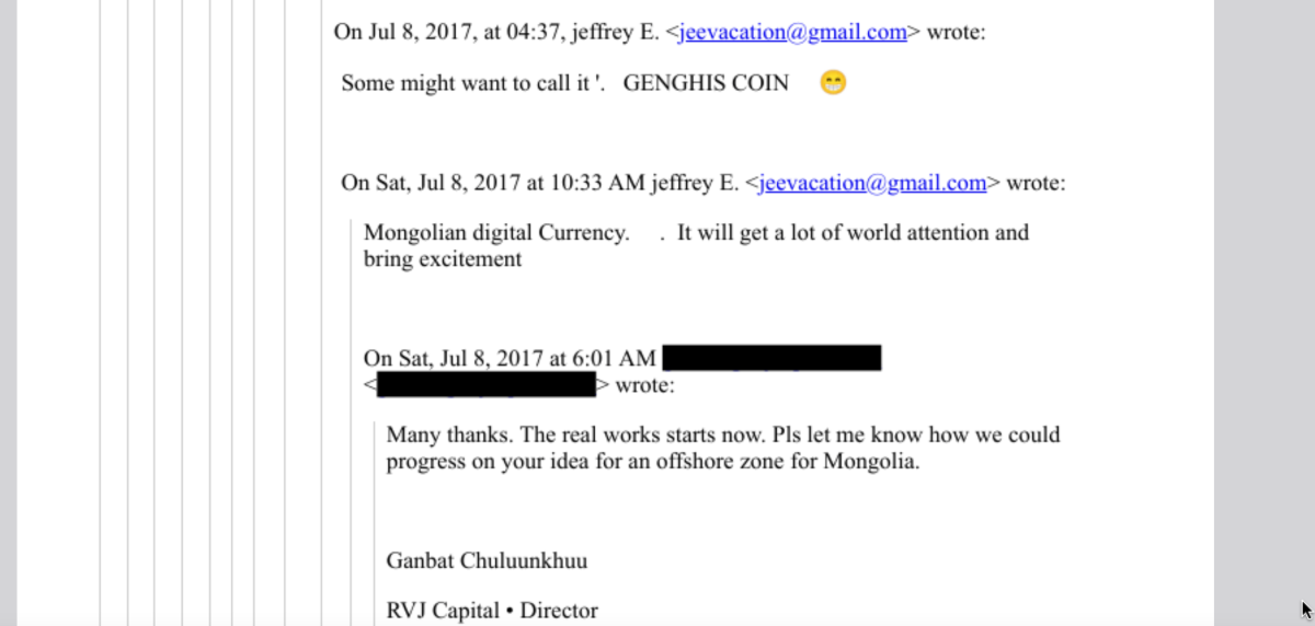 Хариуд нь Эпштэйн “Монголын цахим мөнгө. Энэ бол дэлхий дахины анхаарлыг маш ихээр татах болно. Чингис коин гэж нэрлэж ч болох юм” гэсэн байна.