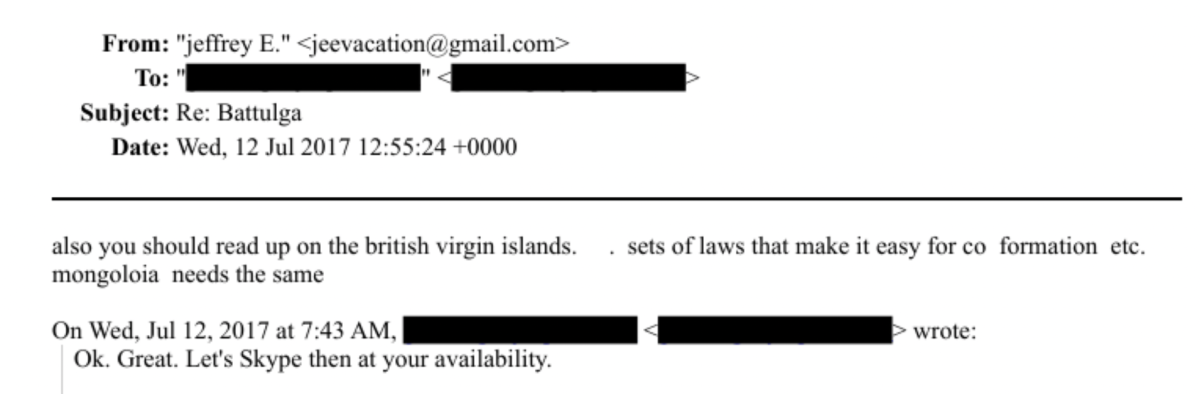 Х.Баттулга ялалт байгууллаа. Албан ёсны дүн мэдээ хэдхэн цагийн дараа гарна. Таны дэмжлэгт (support) баярлалаа гэжээ. Үүний хариуд Эпштэйн “Гайхалтай, Таны өмнөөс болон танай улс орны өмнөөс баяртай байна” гэсний хариуд Ч.Ганбат “Маш их баярлалаа, жинхэнэ ажил одоо л эхэлнэ. Таны ярьж байсан Монголд зориулсан оффшор бүсийн санаан дээр хэрхэн ажил хэрэг болгохыг мэдэгдээрэй” гэжээ. Хариуд нь Эпштэйн “Виржинийн арлуудад байдаг оффшор бүстэй адилхан формат Монголд хэрэгтэй” гэсэн байна.