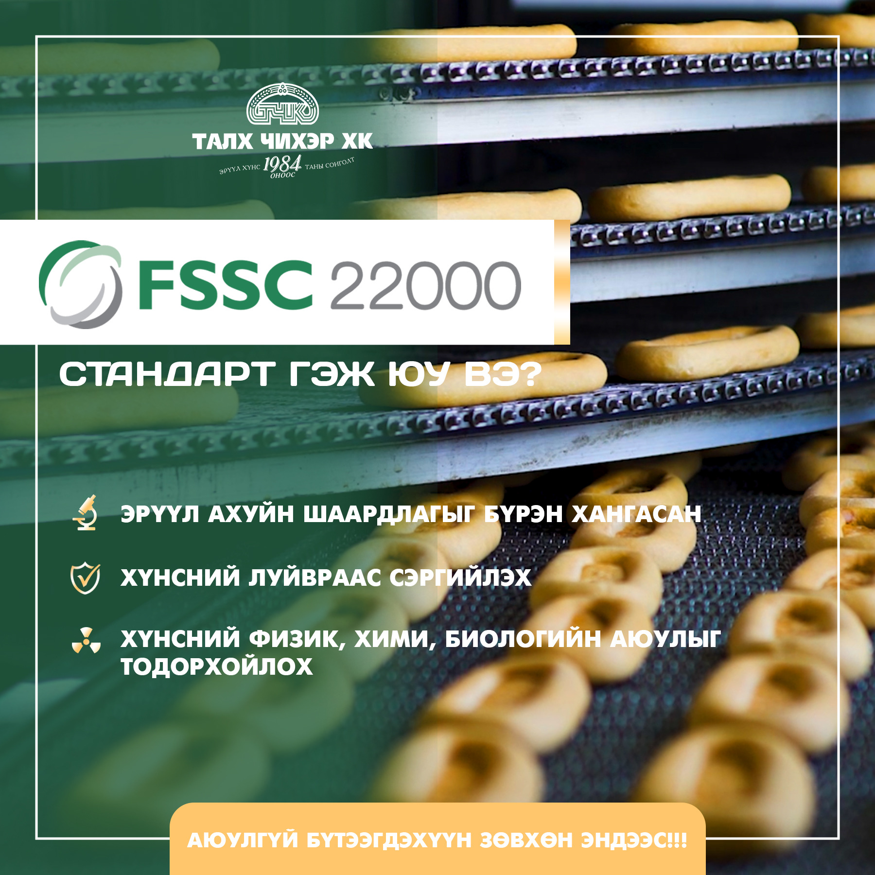 FSSC 22000 стандарт гэдэг нь хүнсний аюулгүй байдлаас гадна хүнсний чанар, хүнсний хамгаалалт, хуурамч бүтээгдэхүүнээс сэргийлэх ажиллагааг хамарсан иж бүрэн удирдлагын тогтолцоо юм. Хүнсний түүхий эд хүлээн авахаас бэлэн бүтээгдэхүүн болж хэрэглэгчдийн гарт хүрэх хүртэлх бүхий л үе шатанд үүсч болох аюул, эрсдэлүүдийг хянадаг байна.