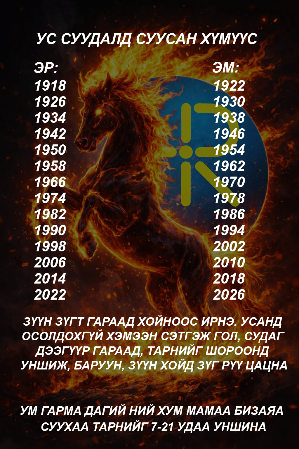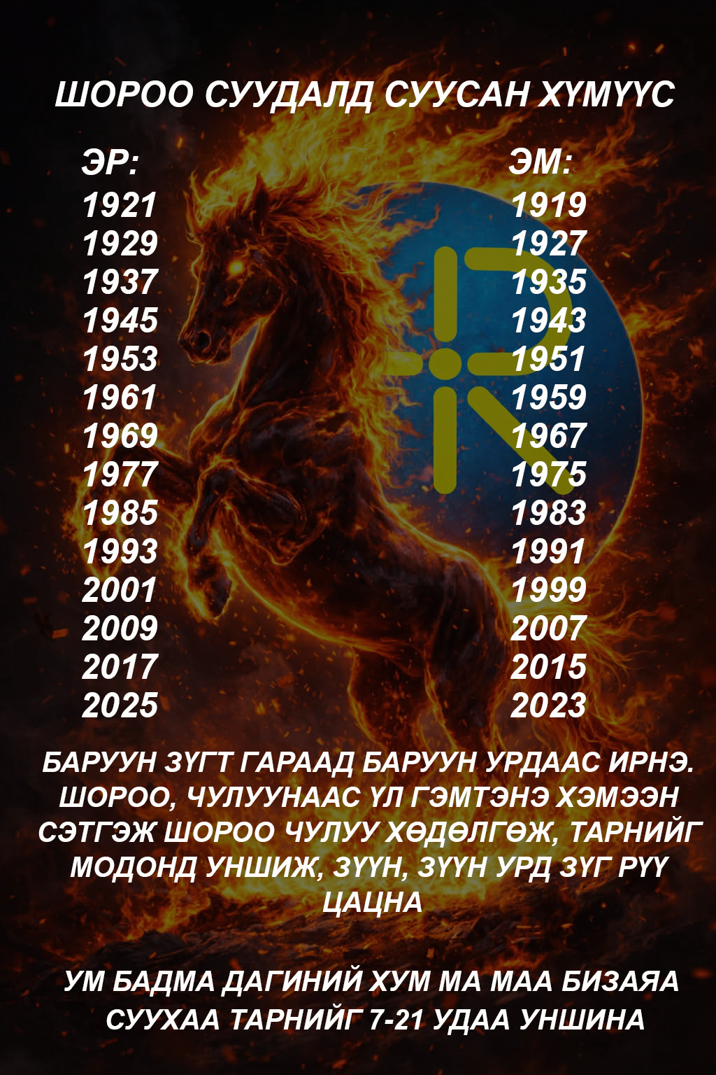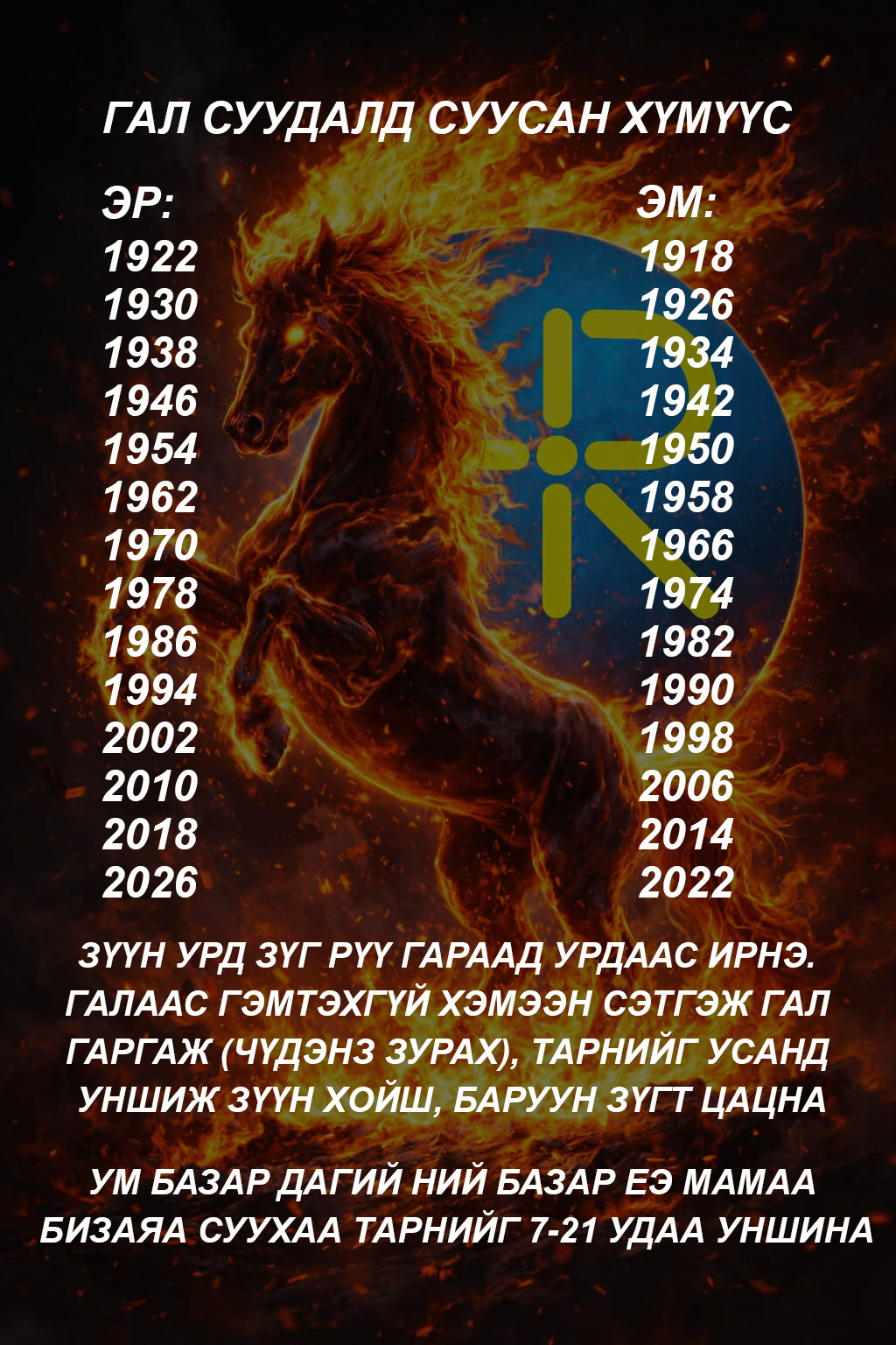 XVIII жарны "Сүрээр дарагч" хэмээгч гал морин жилийн хаврын тэргүүн сарын шинийн нэгний өглөө мөрөө хэрхэн гаргах зааврыг хүргэж байна. Энэ жил таны юу санасан есөн цагаан хүсэл сэтгэлчлэн биелэх болтугай.