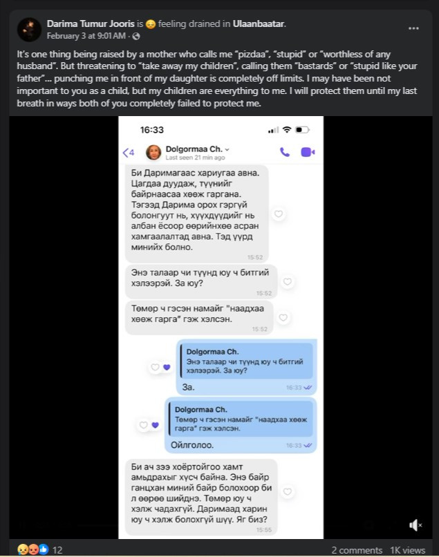 Тэрээр нүүр хуудастаа “Хэдийгээр би хамгийн муу эцэг эхтэй юм шиг санагдаж, сүүлийн 23 жилийн хугацаанд хууль ёсны нөхөн төлбөрөө авч чадаагүй ч гэсэн орчлон ертөнц надад өөрийн гэсэн гайхалтай гэр бүлтэй болох боломжийг олгосонд би маш их талархаж байна. Тэдний өдөр тутмын золиослол, урам зоригийн ачаар би эцэг эхийнхээ 3 жилийн турш тасралтгүй хууль эрх зүйн, сэтгэл зүйн болон бие махбодийн дайралтыг тэсвэрлэж чадсан. Намайг олон удаа хөл дээр минь босгож, эмэгтэйчүүдийн эрхийн төлөө, хүчирхийлэлд өртсөн хүүхдүүдийн эрхийн төлөө, Монгол хүн бүрийн хүсч буй шударга, гэрэл гэгээтэй ирээдүйн төлөө тэмцэхэд урам зориг өгсөн охин Батшугарын Тара охиноороо би бахархаж байна” гэжээ.