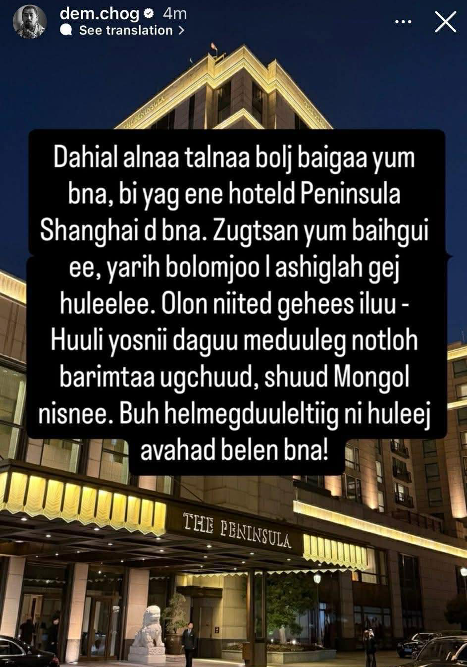 Дахиад “Ална тална” болж байгаа юм байна. Би Peninsula Shanghai зочид буудалд байна. Зугтсан юм байхгүй. Ярих боломжоо ашиглах гэж л хүлээлээ. Олон нийтэд гэхээс илүү хууль ёсны дагуу мэдүүлэг, нотлох баримтаа өгчихөөд Монгол руу шууд ниснэ ээ. Бүх хэлмэгдүүлэлтийг нь хүлээж авахад бэлэн байна” гэжээ.