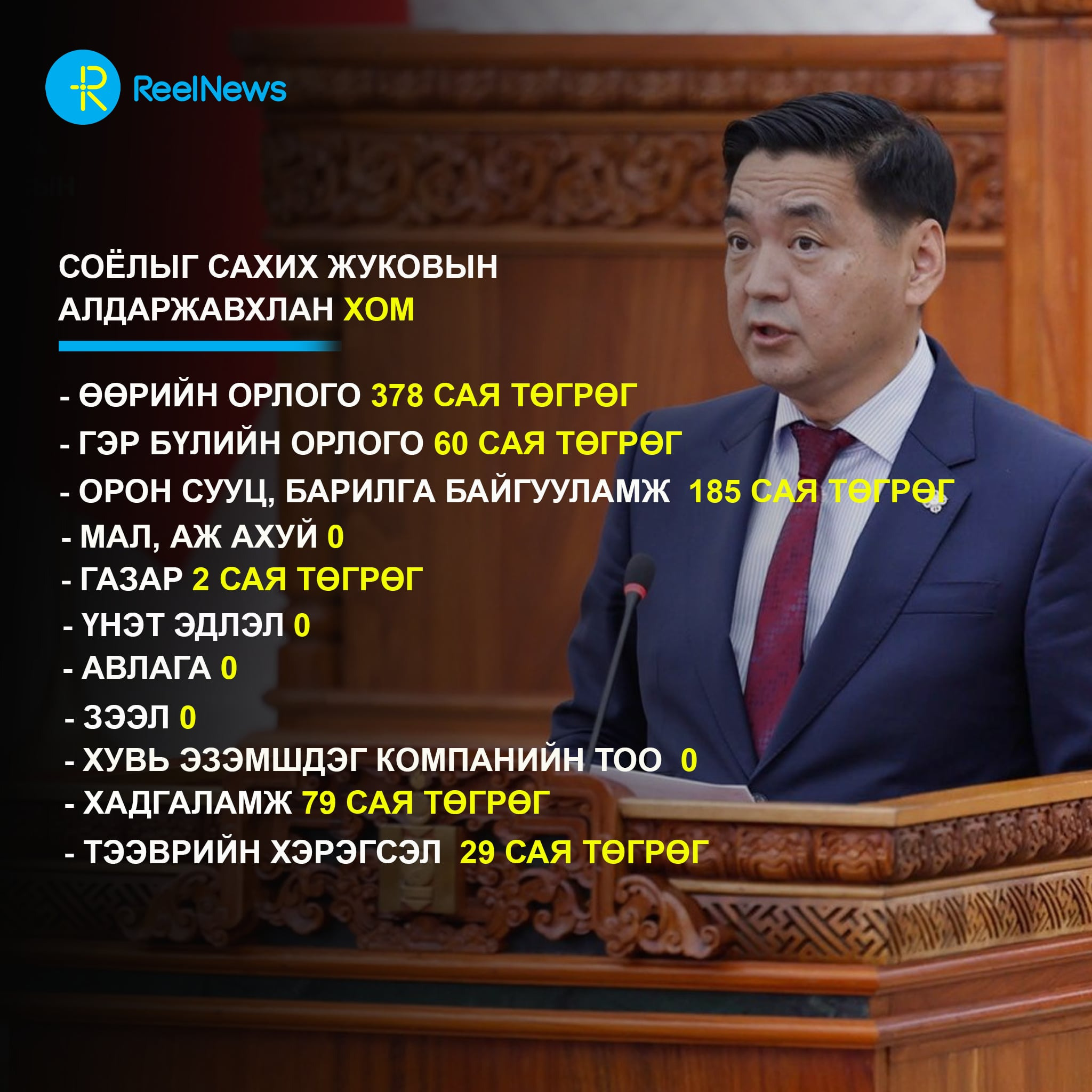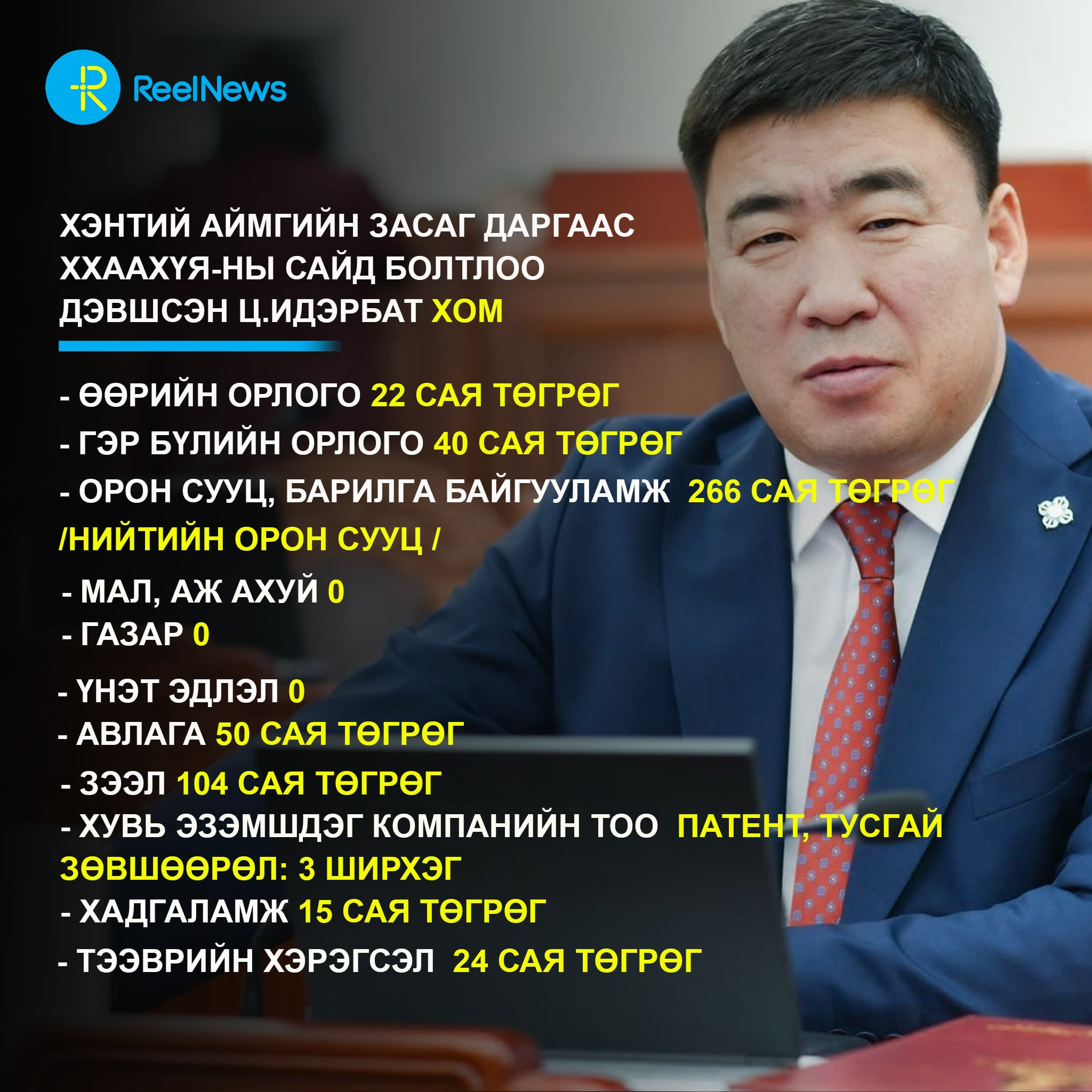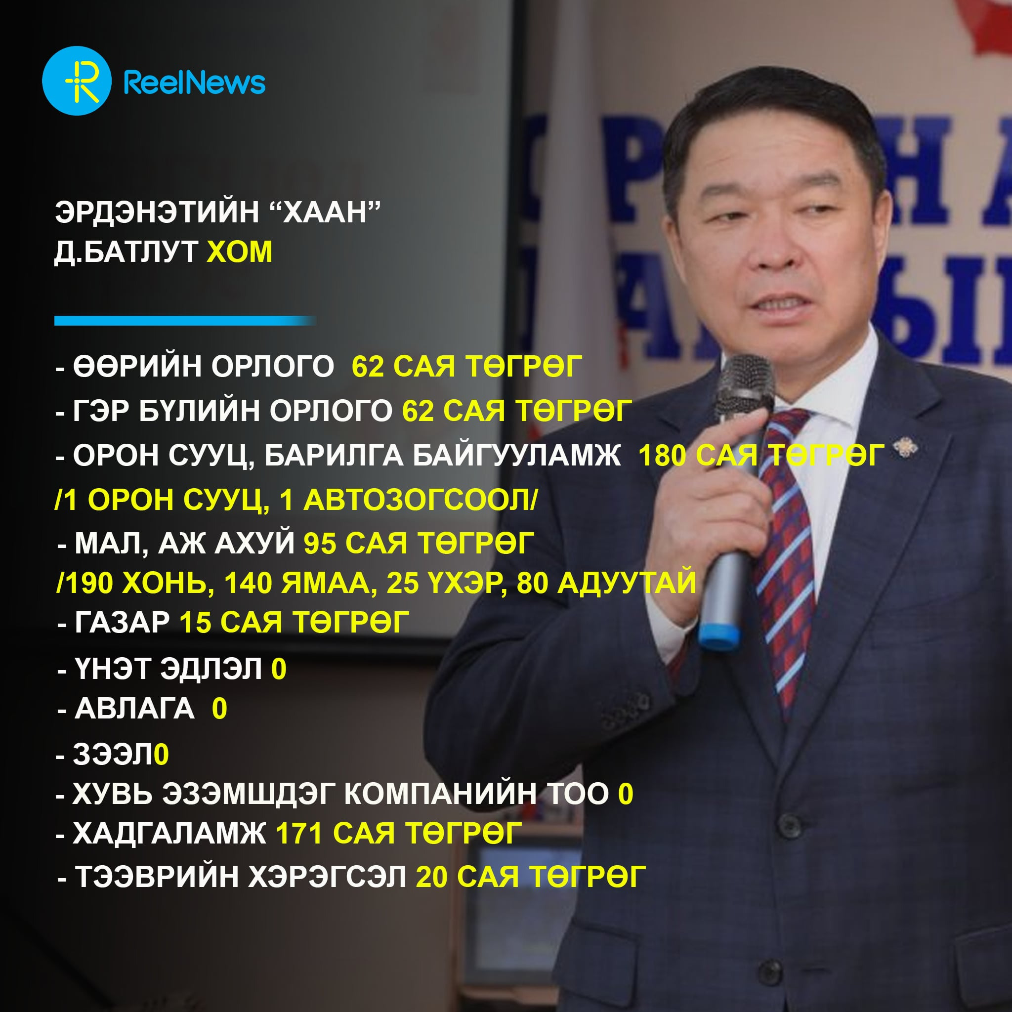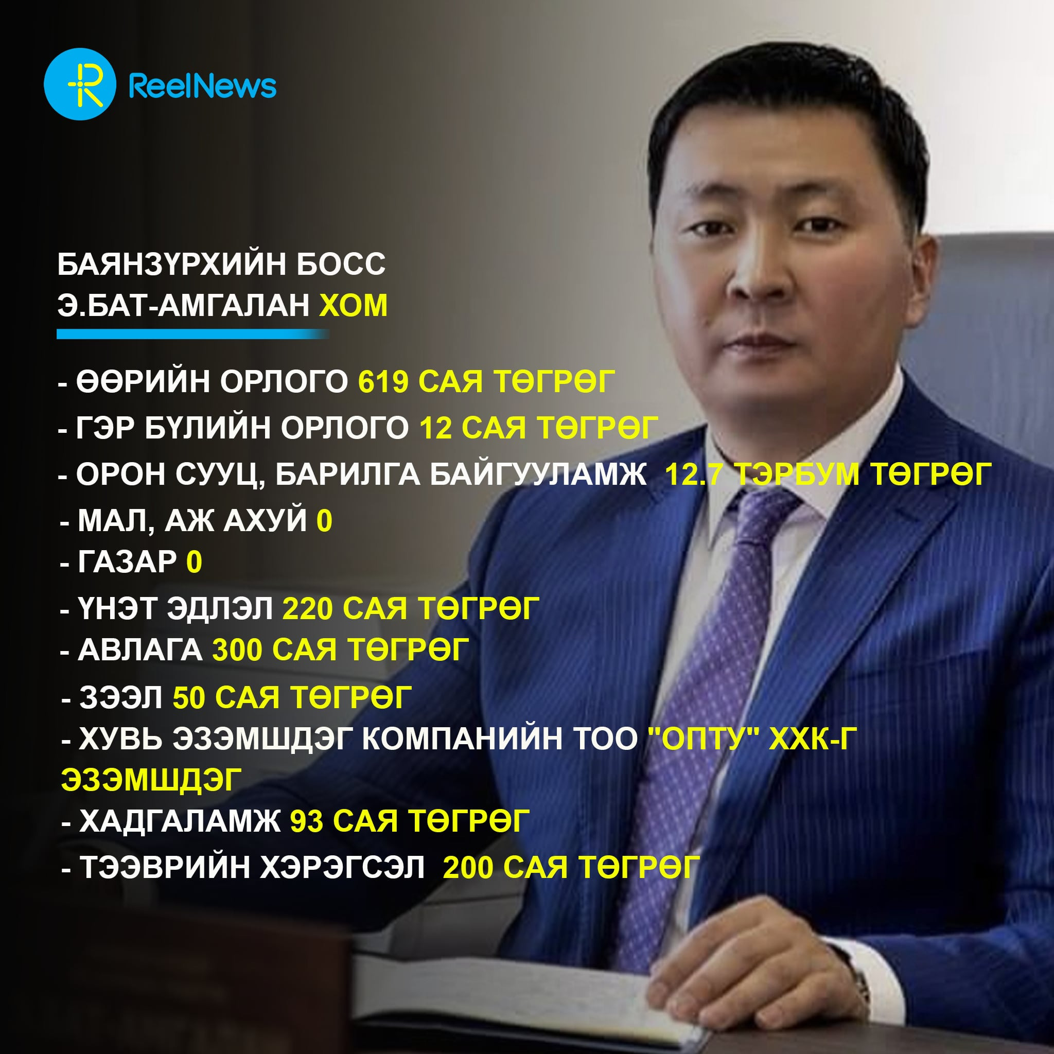 - Үл хөдлөх хөрөнгө: 180 сая төгрөгөөр үнэлэгдэх 1 орон сууц, 1 автозогсоол