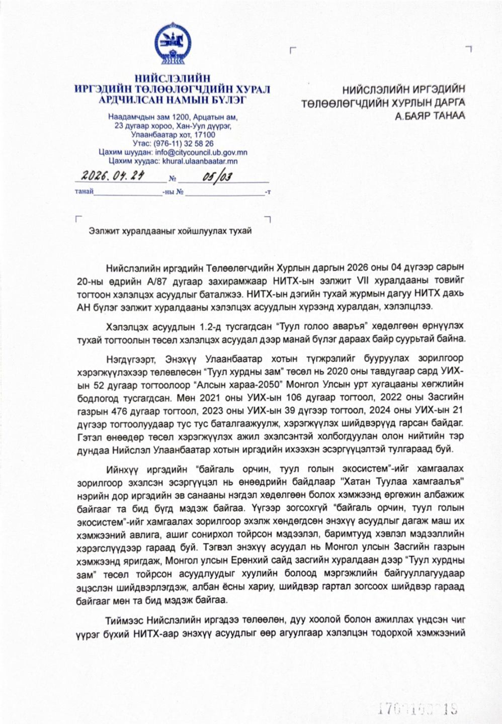 Тэрбээр “НИТХ-ын Зөвлөлийн 2026 оны 4-р сарын 20-ны хуралдаанаар ээлжит хуралдааны товыг зарласан. НИТХ дахь Ардчилсан намын бүлгээс албан бичгээр санал ирсэн. Үүнийг үндэслэн НИТХ-ын даргын хуралдааныг хойшлуулах захирамж гарсан. Ардчилсан намын бүлгээс НИТХ-ын ээлжит VII хуралдаанаар хэлэлцүүлэх асуудал нь иргэдийн эсэргүүцэлтэй тулгараад зогсохгүй, авлига, албан тушаал, ашиг сонирхол тойрсон эргэлзээ бүхий мэдээллүүд хэвлэл мэдээллээр гарч байгаагаас гадна Монгол Улсын ерөнхий сайд Засгийн газрын хуралдаанаар хуулийн болоод мэргэжлийн байгууллагуудаар шийдэх хүртэл зогсоох шийдвэрийг гаргасантай холбогдуулан хуралдаанаар хэлэлцэхээс татгалзаж хойшлуулах шаардлага ирүүлсэн тул 2026 оны 4-р сарын 27-ны өдрийн 10:00 цагт товлосон ээлжит VII хуралдааныг хойшлуулсугай гэсэн захирамж гарсан. НИТХ-ын төлөөлөгчдийг мэдээллээр хангах, хуралдааны товыг дахин тогтоох, тус захирамжийн хэрэгжилтэд хяналт тавьж ажиллах чиглэлээр НИТХ-ын Ажлын албаны дарга бөгөөд Нарийн бичгийн дарга надад үүрэг өгсөн. Үүргийн дагуу төлөөлөгчдөд хурлын тов хойшилсон талаар мэдээлэл өгөөд сууж байна” гэлээ.