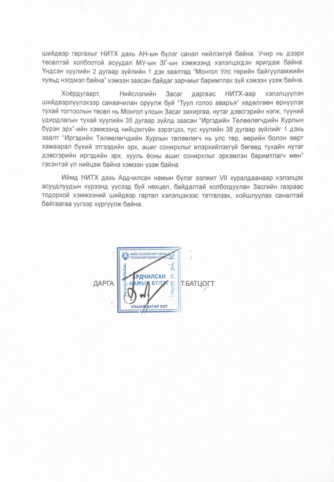 Дашрамд дурдахад АН-ын бүлгээс НИТХ иргэдийн эрх ашиг, байгаль орчны аюулгүй байдлыг нэн тэргүүнд тавих ёстой. Туул голын экосистемийг хамгаалах, Туулын хурдны замтай холбоотой асуудал нийслэлийн хэмжээнд бус, улсын бодлого, хууль эрх зүйн зохицуулалттай шууд холбоотой тул Засгийн газар, УИХ болон холбогдох байгууллагуудын нэгдсэн байр суурь гараагүй нөхцөлд НИТХ-аар яаравчлан хэлэлцэх нь зохисгүй талаар тусгажээ.